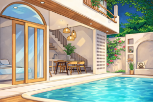 Vila ini dilengkapi dengan kolam renang pribadi, yang dirancang proporsional dengan luas lahan. Area kolam renang terhubung dengan taman kecil dan ruang terbuka, menciptakan suasana santai dan eksklusif.