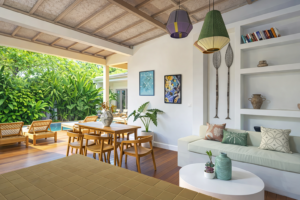 Ruang tamu dan ruang makan terhubung langsung dengan area luar vila, menciptakan pengalaman hidup indoor-outdoor yang menjadi ciri khas hunian tropis di Bali.