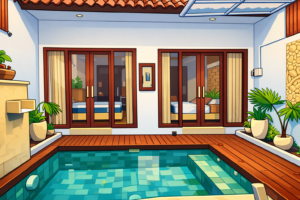 Salah satu fasilitas yang paling menarik dari vila ini adalah private swimming pool. Kolam renang pribadi menjadi elemen penting dalam hunian di Bali karena memberikan pengalaman hidup yang lebih santai dan eksklusif.