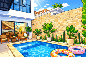 Kolam renang ini menjadi pusat aktivitas santai di dalam vila. Penghuni dapat menikmati suasana tropis Bali tanpa harus meninggalkan rumah. Area di sekitar kolam juga dapat dimanfaatkan sebagai tempat bersantai, berjemur, atau berkumpul bersama keluarga dan teman.