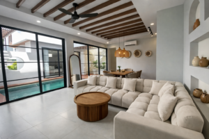 Villa ini mengusung konsep tropical modern, yang terlihat dari penggunaan garis arsitektur bersih, warna netral, serta bukaan besar yang memungkinkan cahaya matahari masuk secara optimal. Elemen kayu, batu alam, dan material modern dipadukan secara harmonis untuk menciptakan suasana hangat dan elegan.